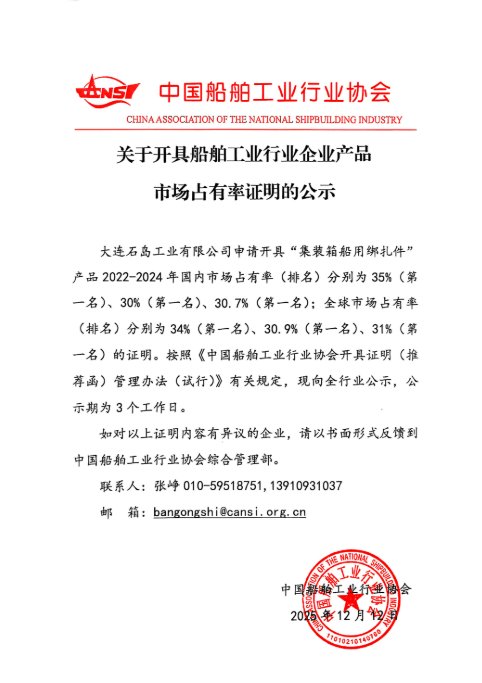 关于开具船舶工业行业企业产品市场占有率证明的公示