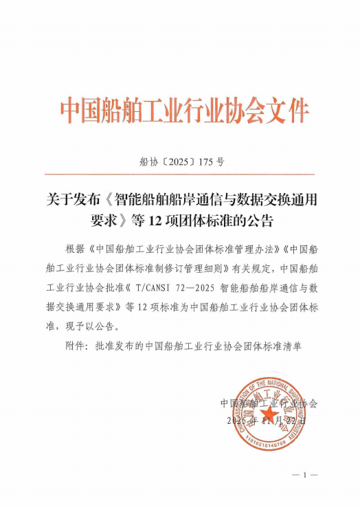 关于发布《智能船舶船岸通信与数据交换通用要求》等12项团体标准的公告
